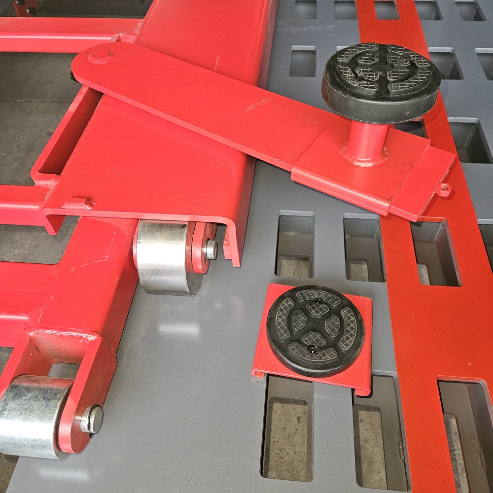 Платформа стапеля имеет продольные пазы, что позволяет устанавливать 4 кузовных зажима в любом месте платформы. Более того, наличие пазов позволяет полностью использовать поверхность платформы в процессе правки кузова.